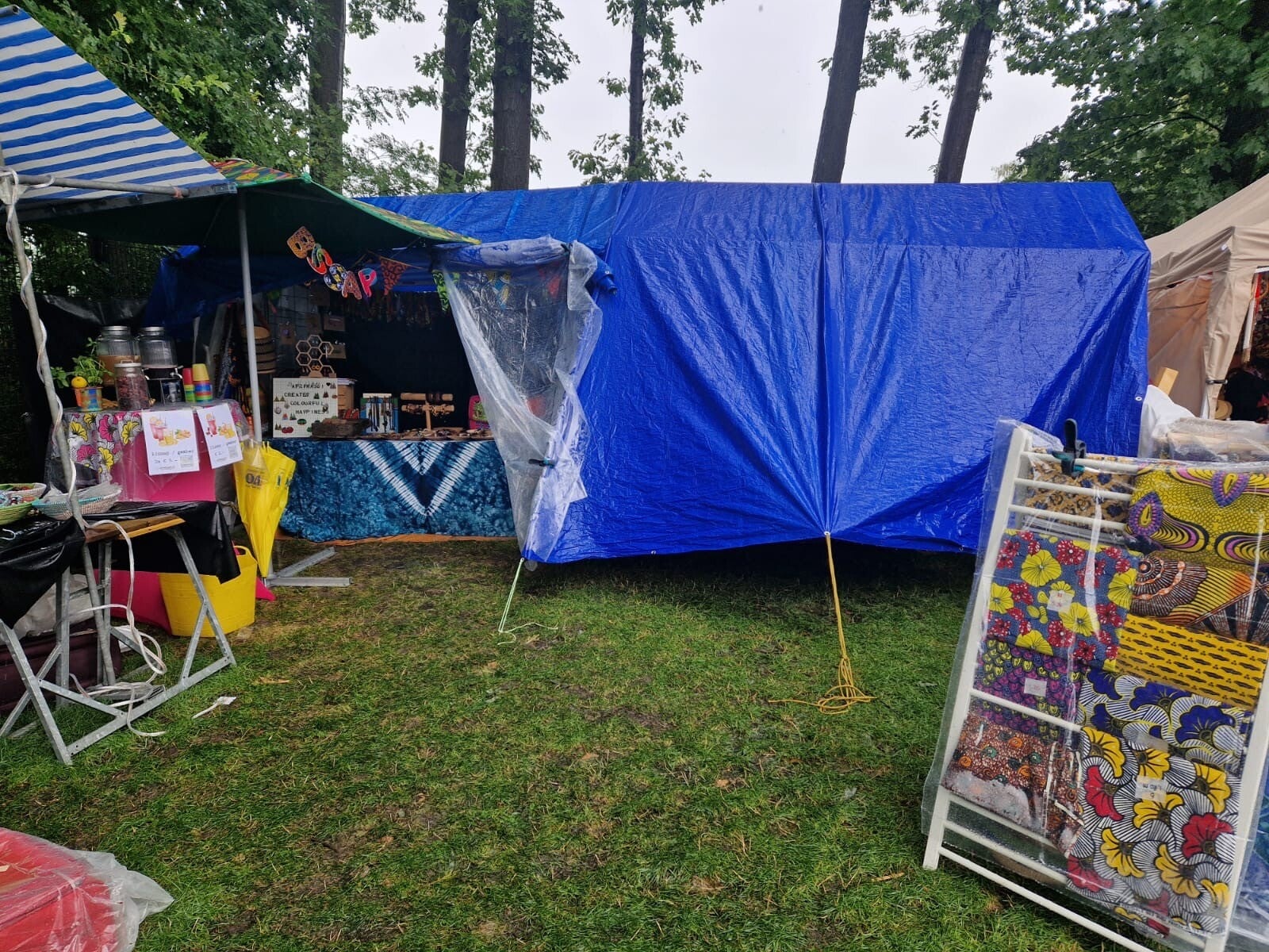 En natuurlijk al weken.. /maanden voor in voorbereiding zijn; Jossie naait zich een naaielleboog (jaa die bestaan ook; meest voorkomende oorzaak -kerststerren èn vrolijke vlaggenlijnen in veelvoud ;)- En ja, we worden er nog altijd heel vrolijk van! Ik denk oprecht dat mn lach het hele weekend niet van mn gezicht is geweest... nee ook niet toen het regende! Want Ja; wij hadden steady een tent gebouwd met soort van afwatering en ook onder de bissap parasol stond men gezellig droog. De tent was een soort fuik, waarin de uitweg zoek was... maar wel heel veel leuks te bewonderen.. en te kopen natuurlijk!